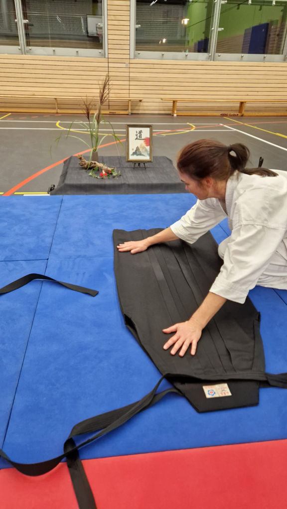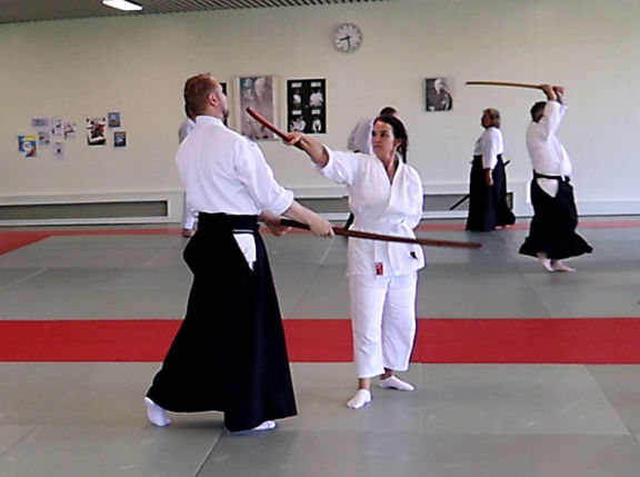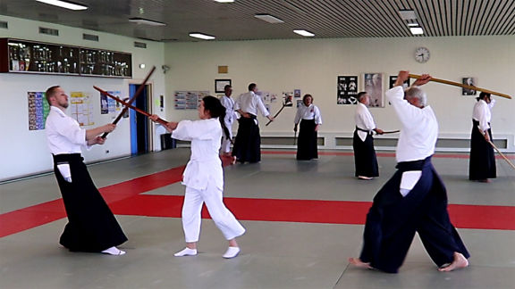 • die Gleichwertigkeit der waffenlosen Techniken (Aikitai) und der Waffentechniken mit Stab (Aikijo) und Schwert (Aikiken),